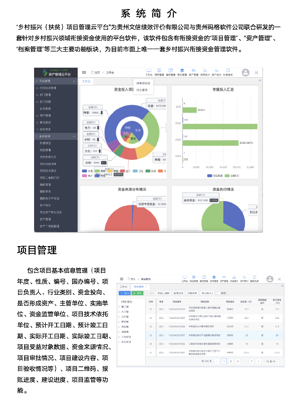 “乡村振兴(扶贫)项目管理云平台”为贵州文信绩效评价有限公司与贵州码格软件公司联合研发的一套针对乡村振兴领域衔接资金使用的平台软件,该软件包含有衔接资金的“项目管理”、“资产管理”、“档案管理”等三大主要功能板块,为目前市面上唯一一套乡村振兴衔接资金管理软件。主要功能有: