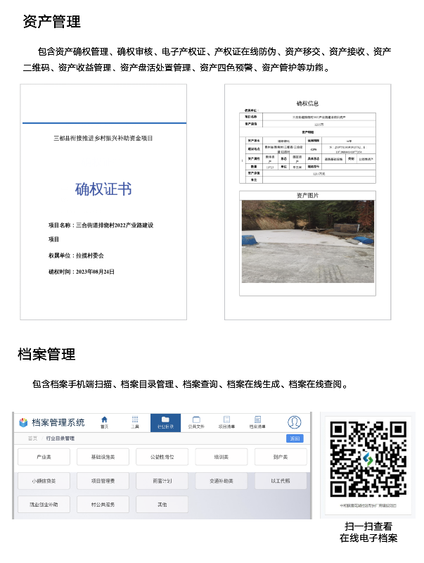 资产管理:包含资产确权管理、确权审核、电子产权证、产权证在线防伪、资产移交、资产接收、资产二维码、资产收益管理、资产盘活处置管理、资产四色预警、资产管护等功能。